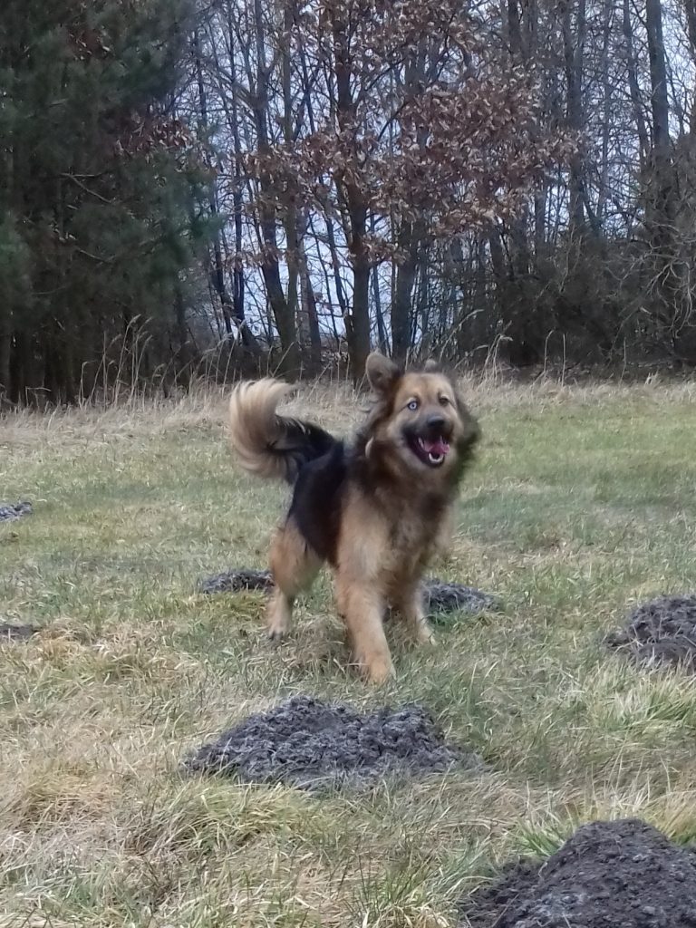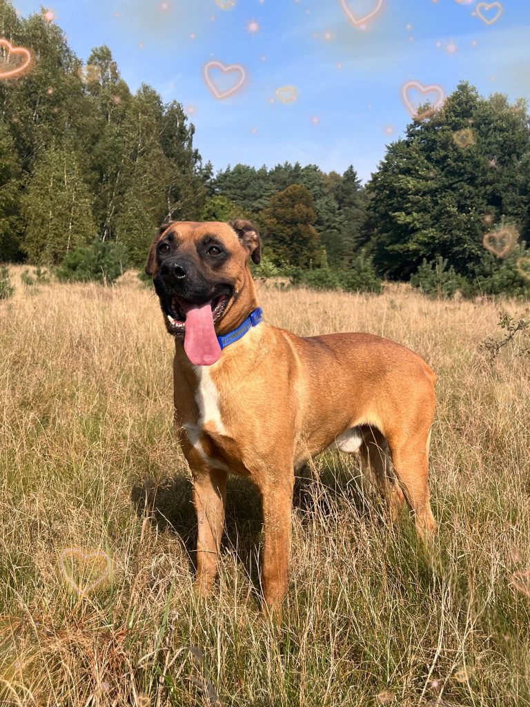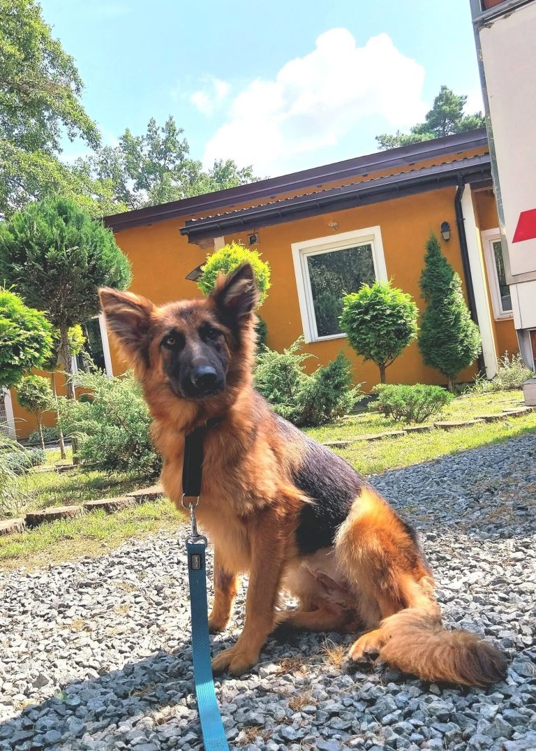 Ma dobry kontakt z psami, bardzo przyjaźni się ze swoim kompanem z boksu Orionem, chociaż bywa i tak, że zacięcie potrafi bronić swojej miseczki .